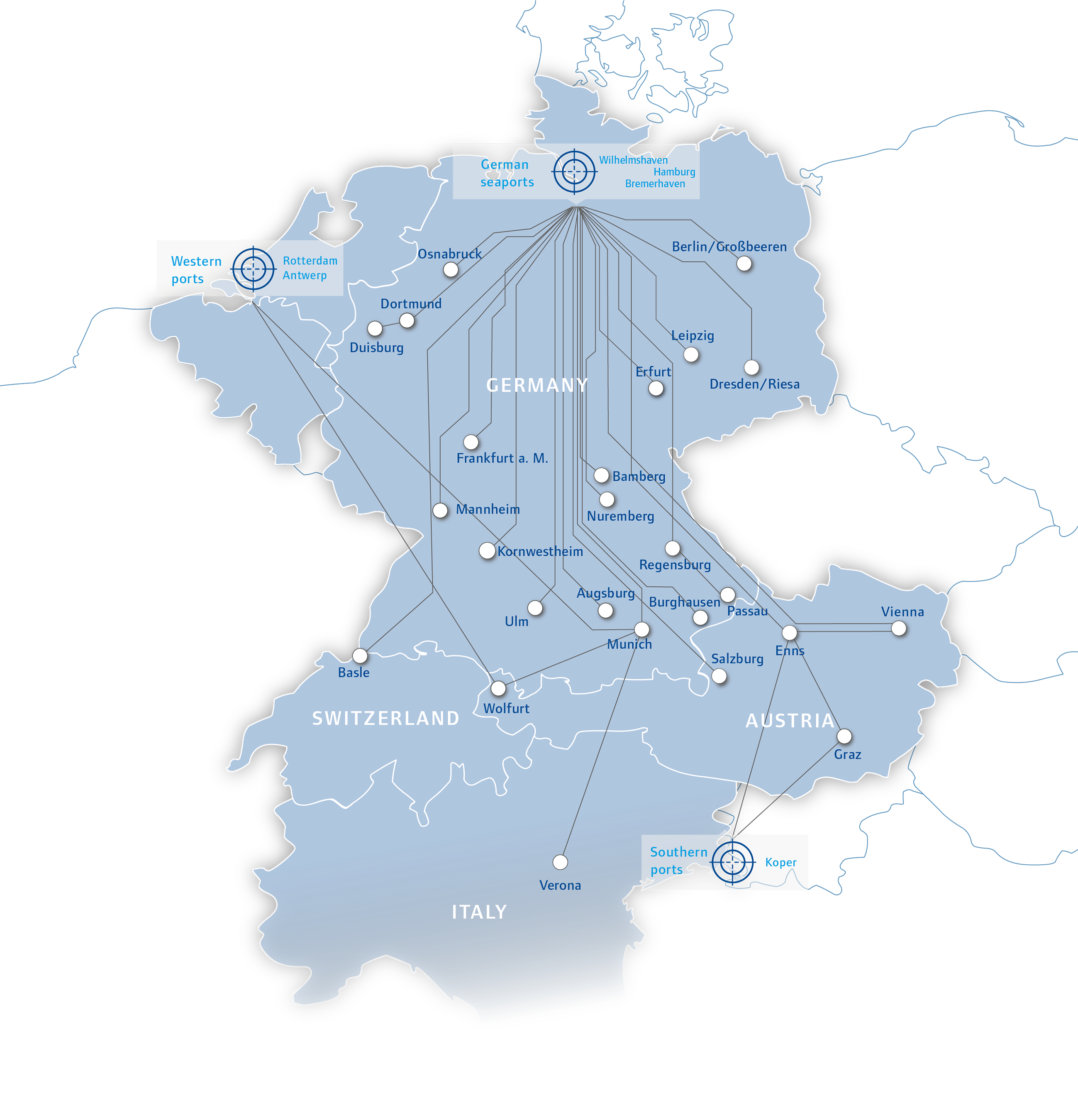 - 6 ports: Hamburg, Bremerhaven, Wilhelmshaven, Koper, Antwerp, Rotterdam