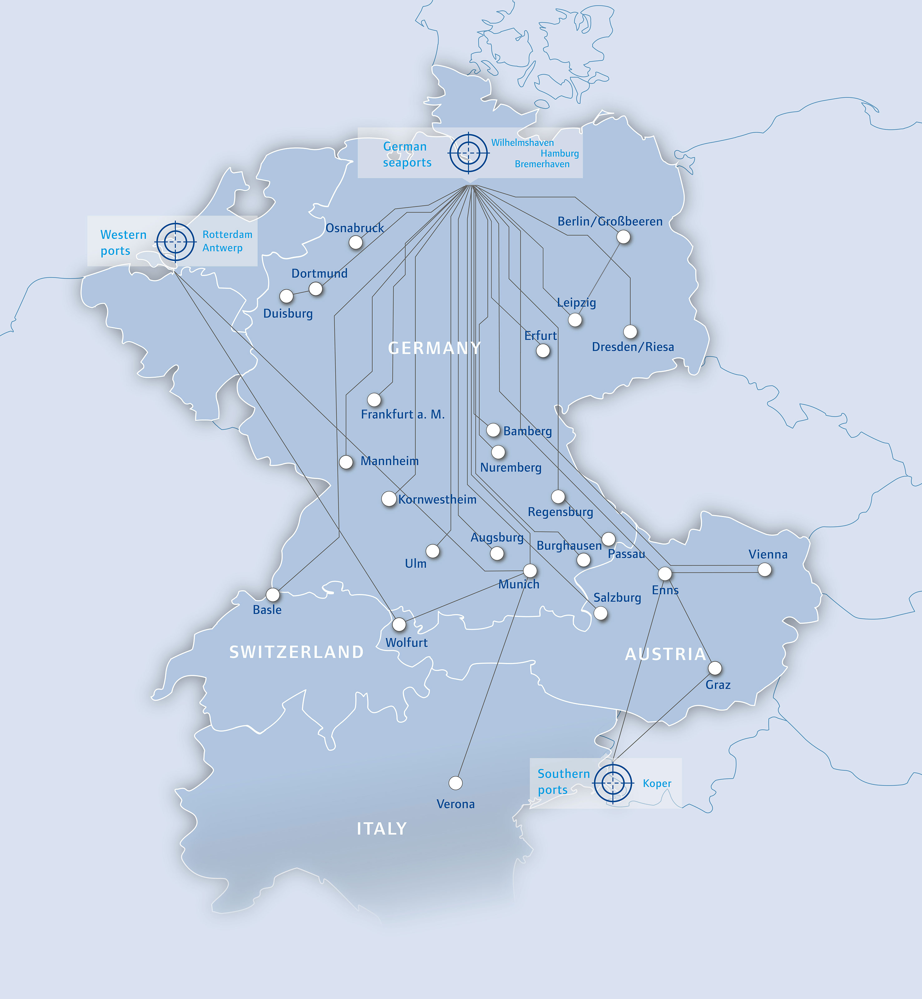 - Scope of service: 25 terminals in Germany, Austria, Switzerland, and the Czech Republic. 270 trains running per week, more than 13,000 connections, over 80 depots, over 15,000 connections.